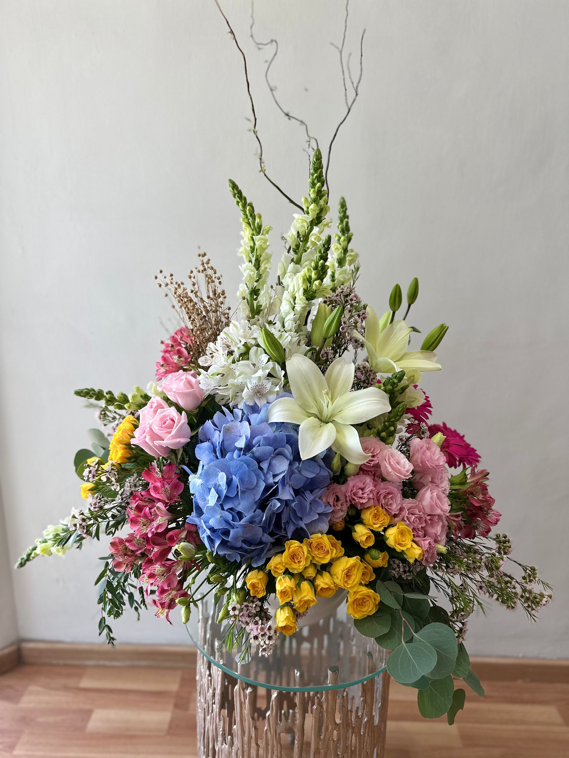 Arreglo de flores variadas en colores vibrantes con follaje y base de barro.