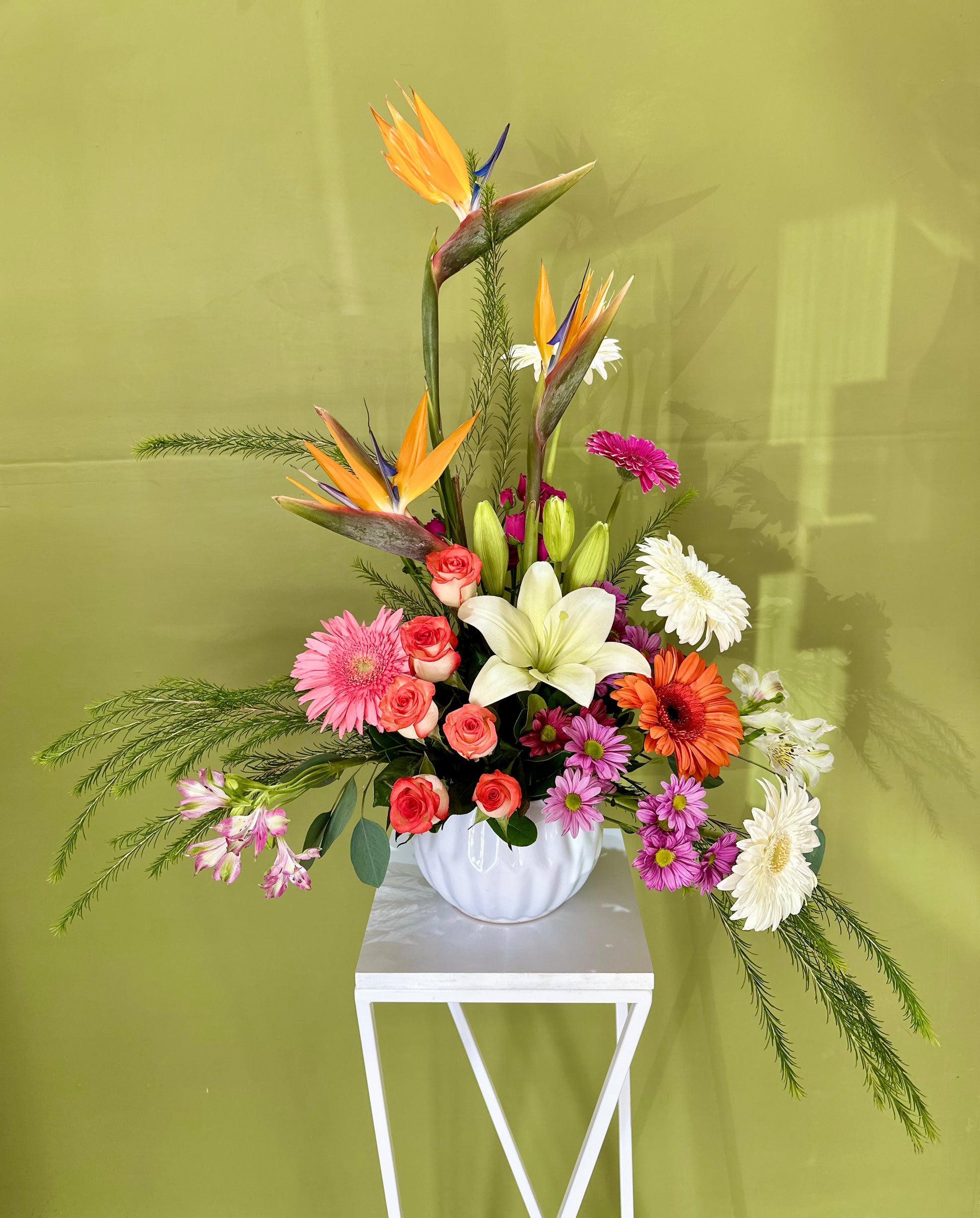 Arreglo floral con ave, rosa, gerberas, margaritas, lilies y follaje en base de cerámica.
