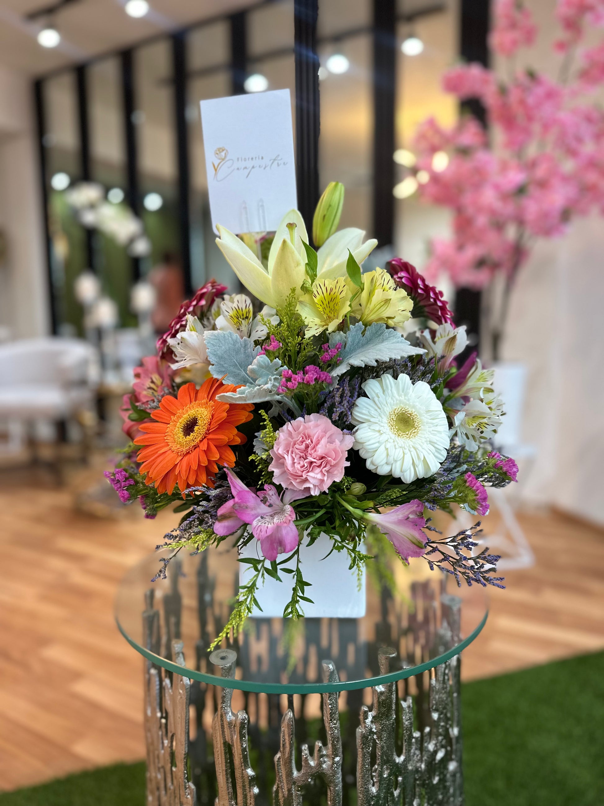 Arreglo floral de flores variadas en colores vivos acompañado de follaje en base de barro.