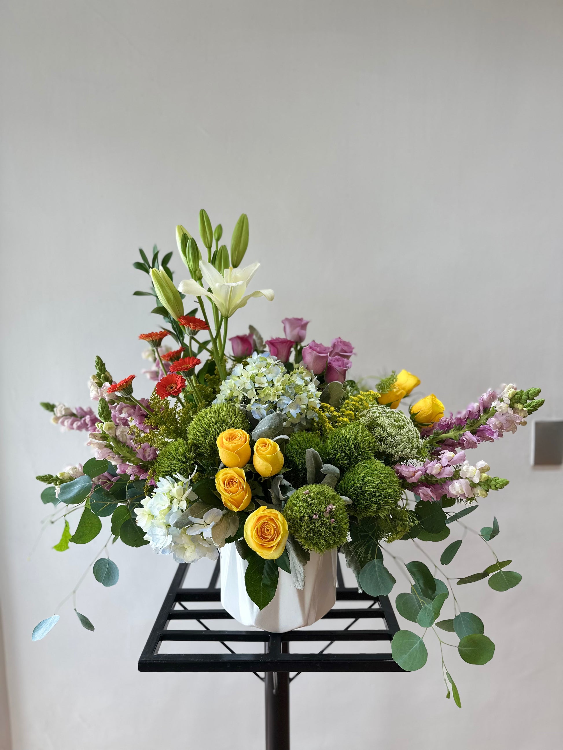 Arreglo floral de flor variada en tonos vivos acompañado de follaje en base de cerámica.